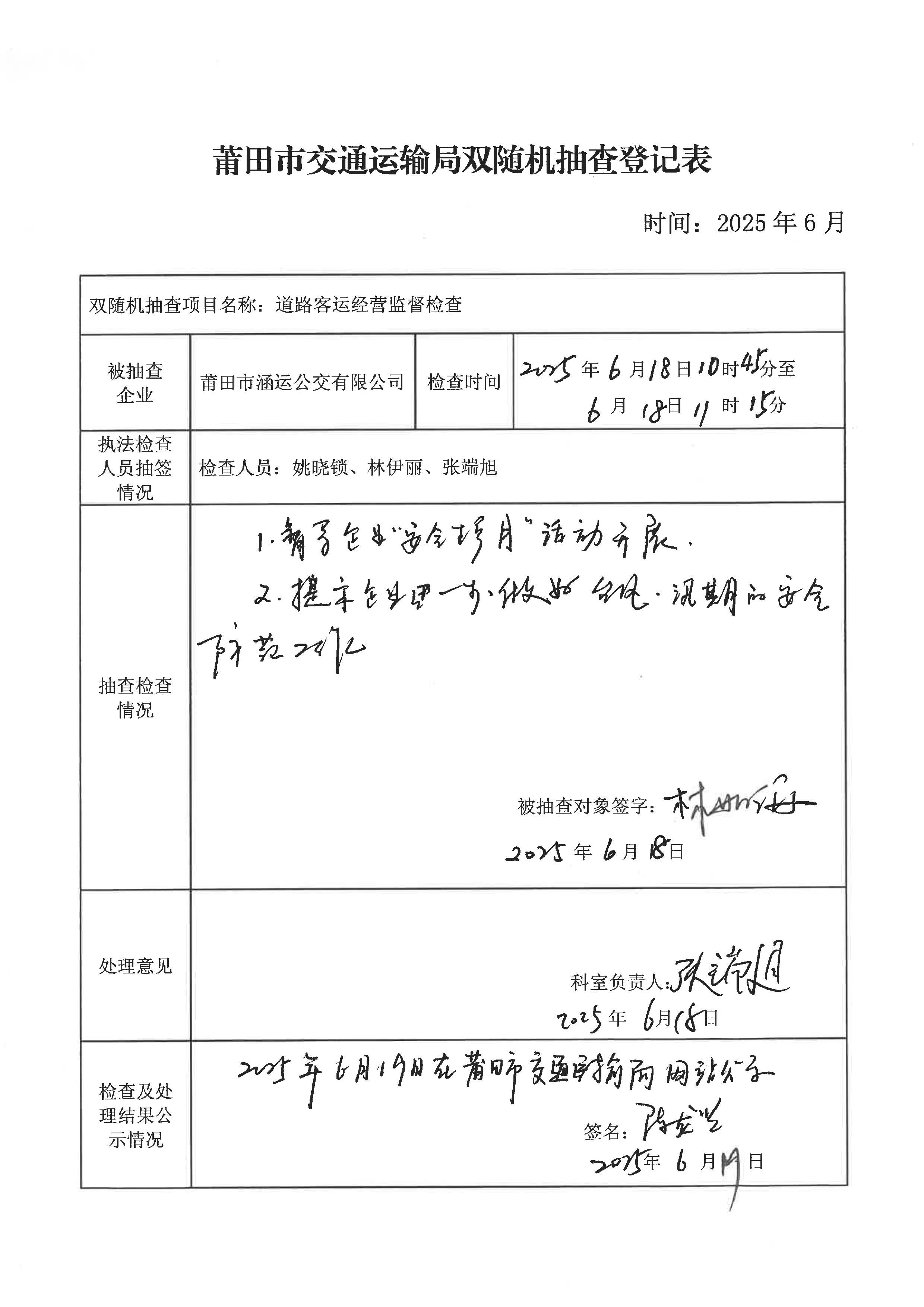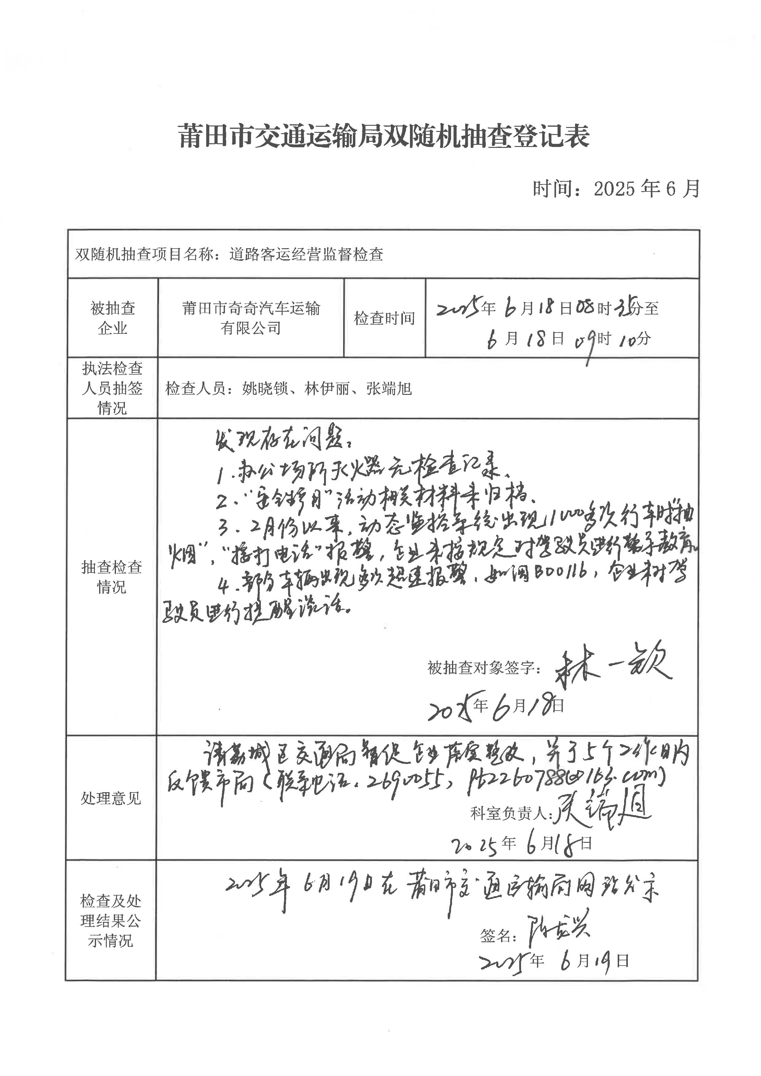 莆田市交通运输局2025年第二季度道路客运经营监督双随机抽查