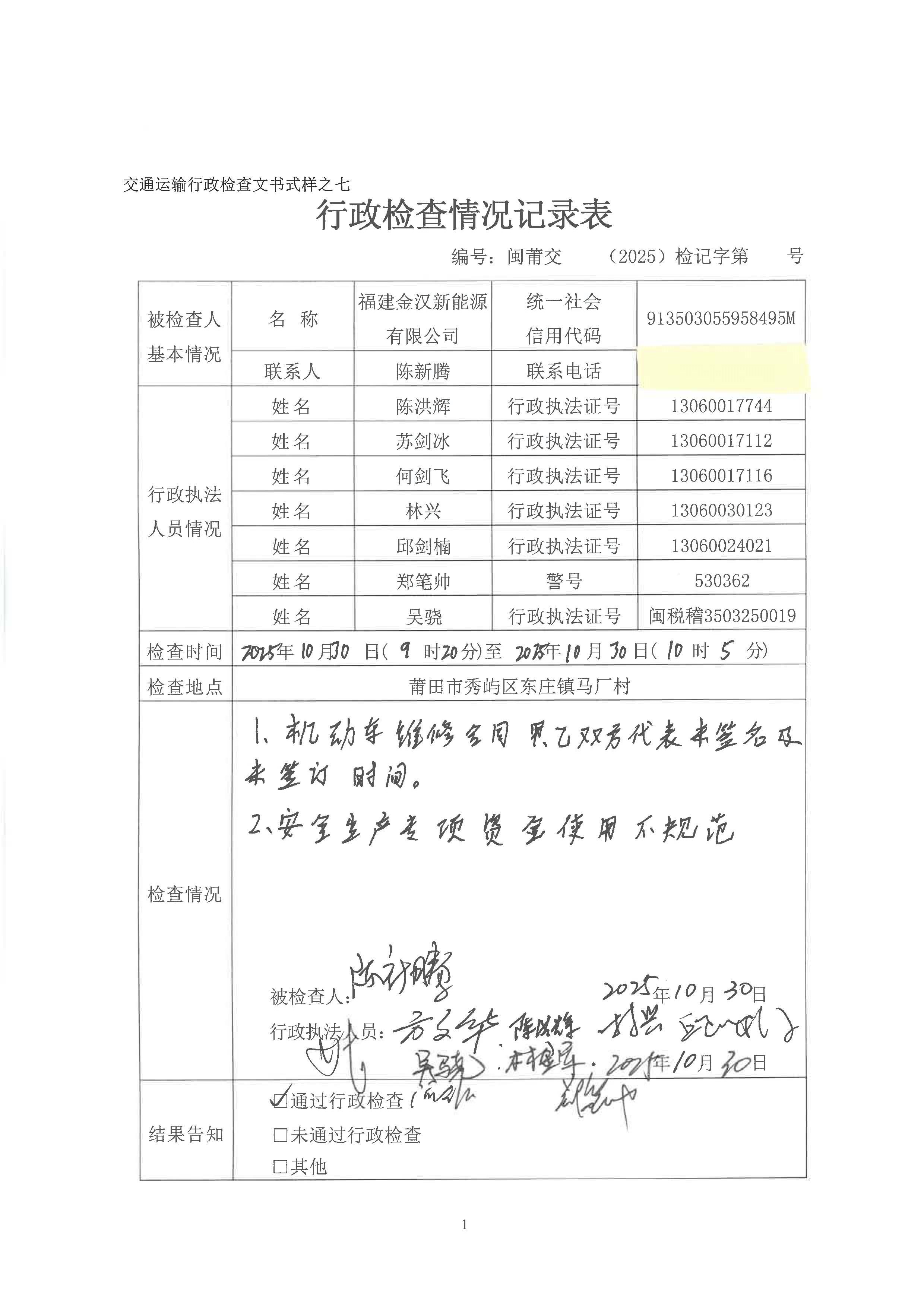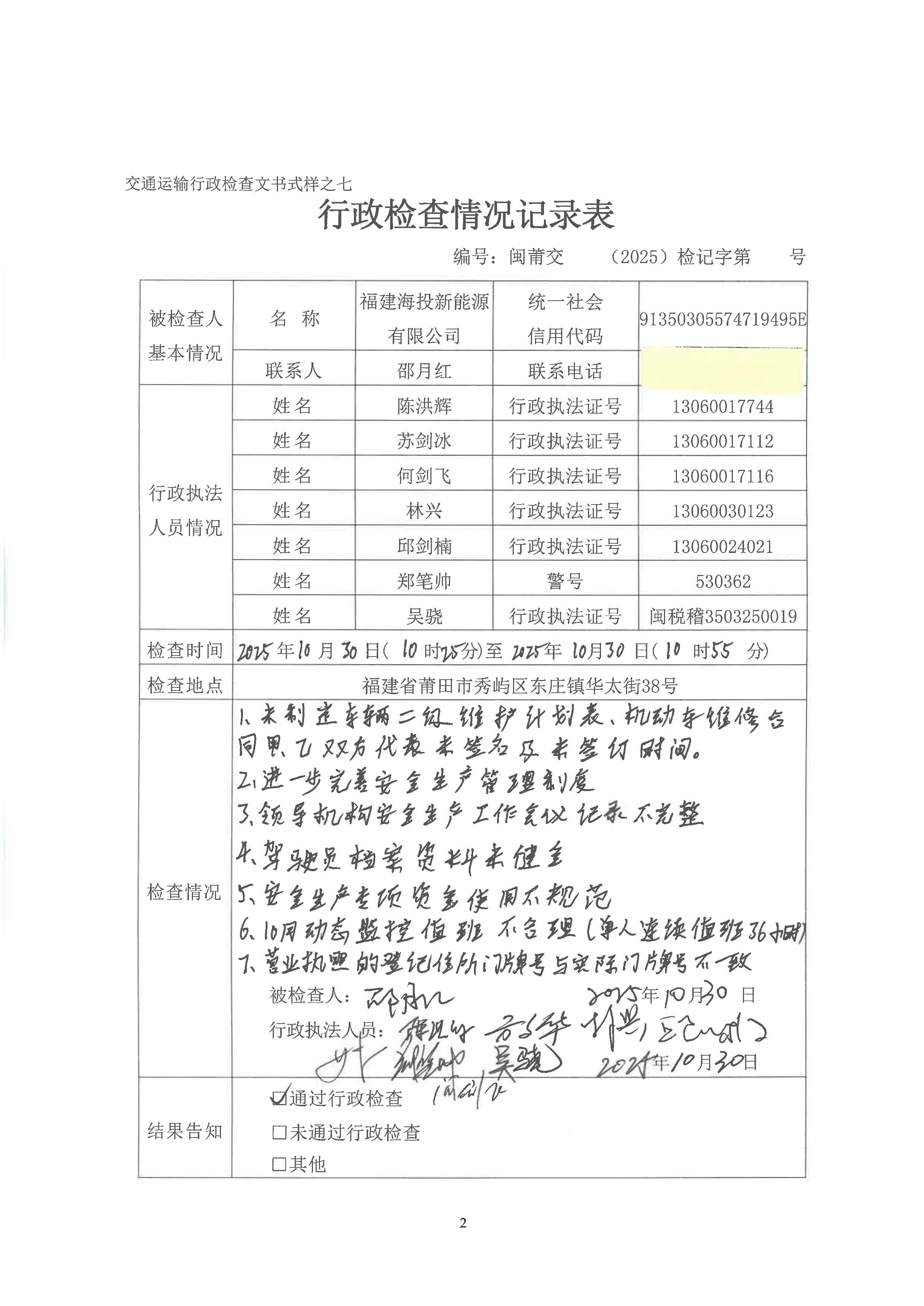 莆田市交通运输局2025年度经营性道路危险货物运输企业“双随机、一公开”检查情况记录表