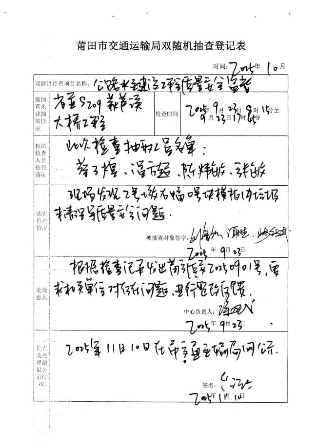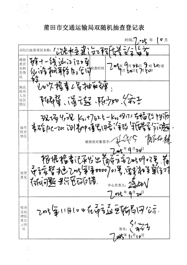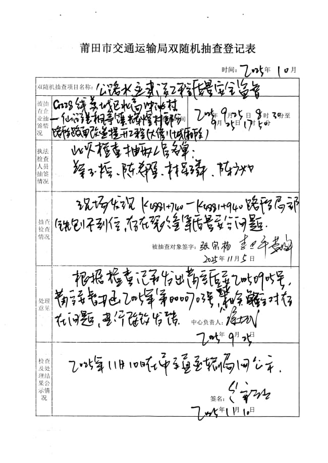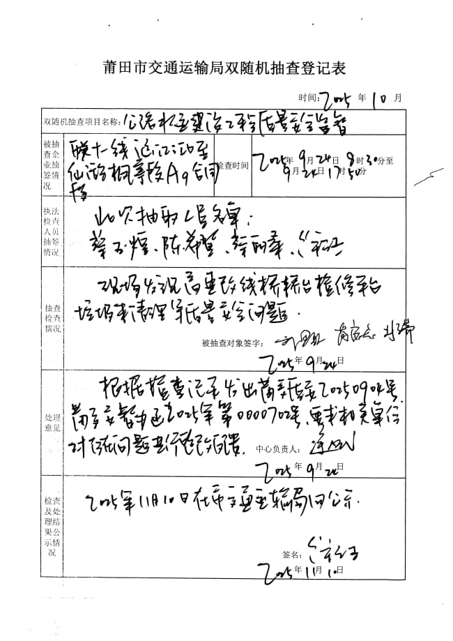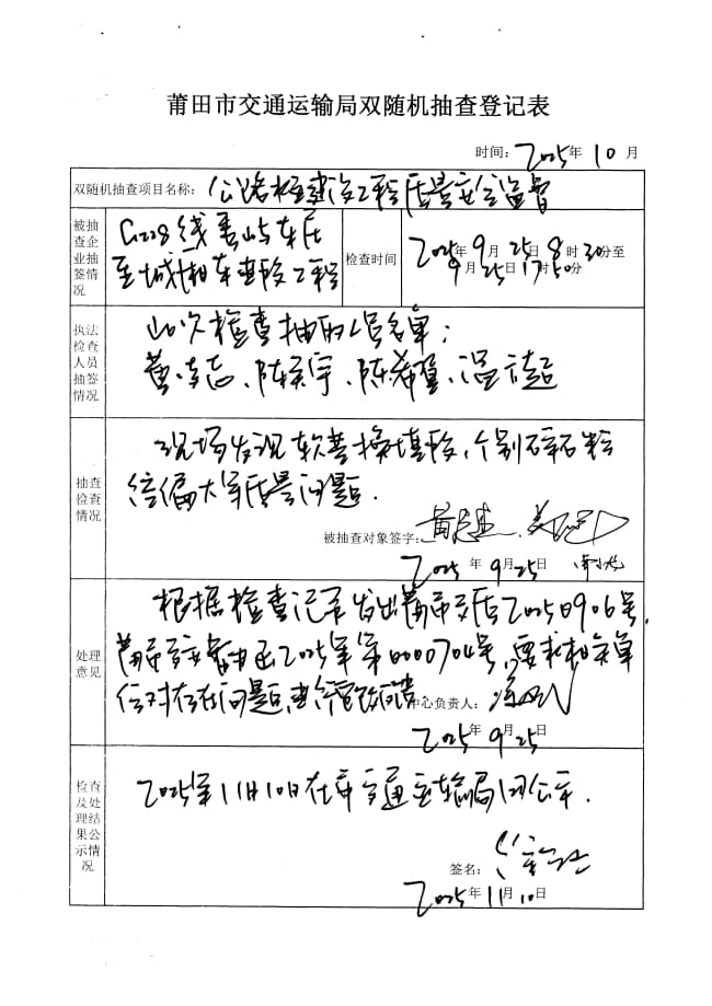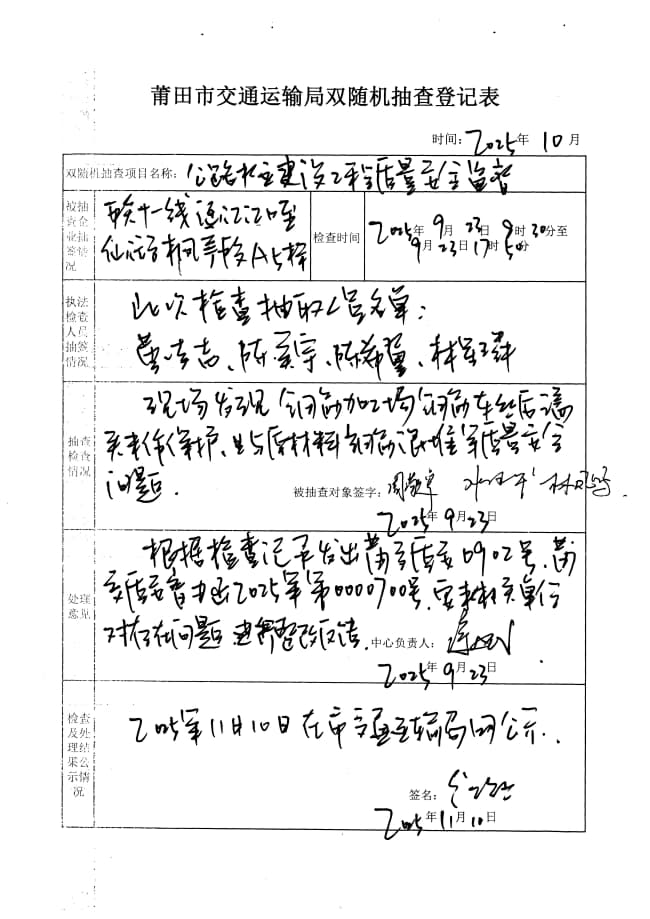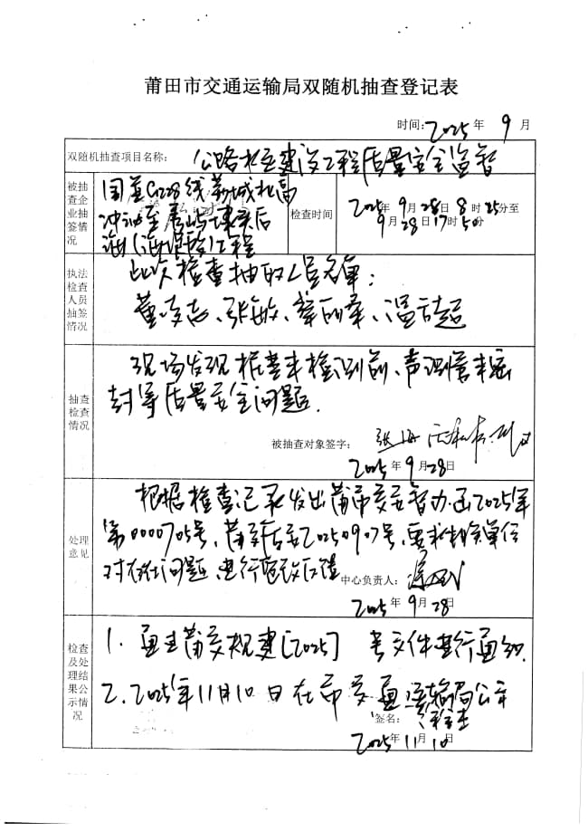 莆田市交通运输局2025年度第三季度在建普通公路水运建设工程质量安全生产监督双随机抽查